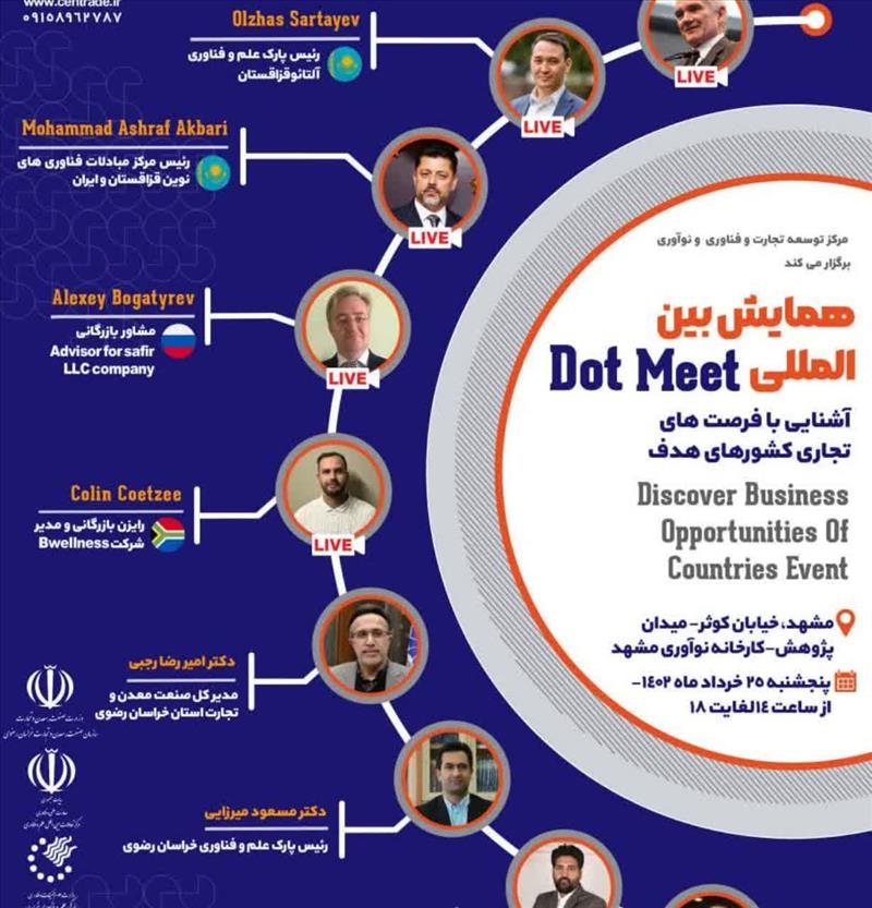 همایش بینالمللی آشنایی با فرصتهای اقتصادی و تجاری کشورهای ایتالیا، قزاقستان، روسیه و آفریقای جنوبی با عنوان «Dot Meet» به منظور تبادل تجربیات و گسترش تعاملات مشترک توسط مرکز توسعه تجارت فناوری و نوآوری با همکاری پارک علم و فناوری خراسان عصر روز پنجشنبه در مشهد برگزار شد.